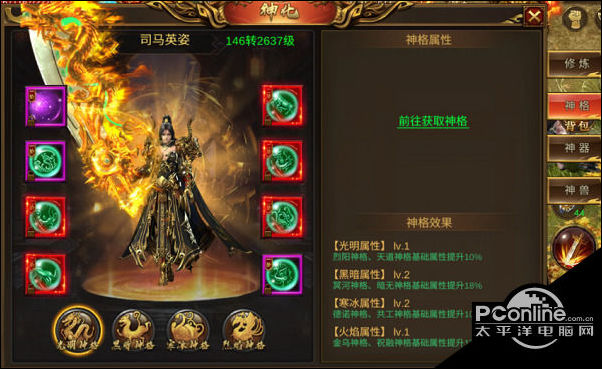 当每种属性的两种神格凑齐,将激活神化属性加成,神格等阶越高,基础属性的神化加成效果越高哦!