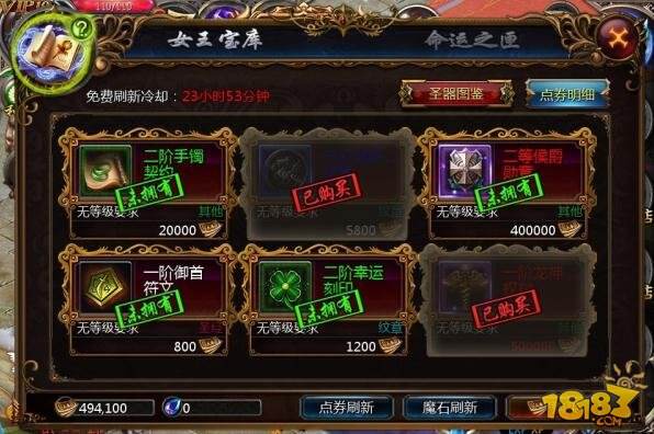 如果你不愿等待女王宝库免费推送的这段漫长时光,想要快速提升自己的实力,你也可以点击右下角的“点券刷新”或“魔石刷新”,以点券/魔石来刷出新一批圣器——当当当当!这样新一批圣器就会出现在女王宝库咯!赶快挑选吧!