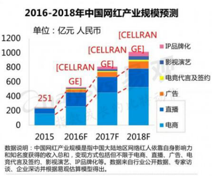 易观发布的网红产业规模预测,未来两年网红经济可以撬动千亿市场。