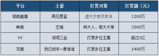 其实,200多万人民币的投入,在其他直播平台里并算不上土豪。比如,陌陌直播的头号土豪“再见是蓝”,已经打赏给自己喜欢的女主播阿冷1200万人民币;映客直播的头号土豪“空城”,已经在平台打赏出去约3200万人民币;在YY直播里被称为“神壕”的流氓三金,已经在YY为天佑、阿哲、利哥等花费过亿人民币。