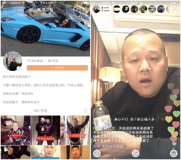 而川哥,也就是那时注册了快手,开始他的大手笔快手打赏之旅。他迅速成为铁岭小辉、王小源、豪哥等快手红人的“秒榜哥”(给主播刷礼物迅速成为榜一)。