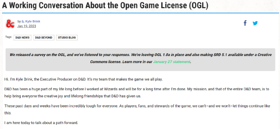 今年一月份,威世智提出新的授权许可证,新版OGL1.1授权协议草稿公布后,消息直接引爆了DND(龙与地下城)创作者社群,原创和独创内容的寿命受到威胁,后来威世智又为这一授权变更风波致歉。多年来,龙与地下城这一IP的公共性早已在各种平台或媒介上深入人心,可以说是“跨媒体叙事”的一个鲜活的例子。