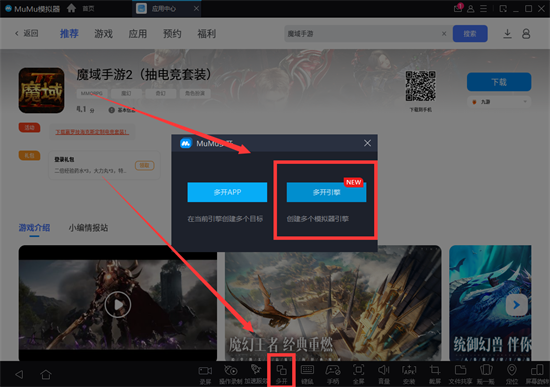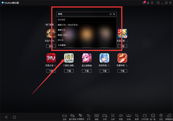 第二步:打开MuMu模拟器,在点击上方搜索栏,搜索【魔域手游2】即可进入游戏商店页面,下载和安装游戏。