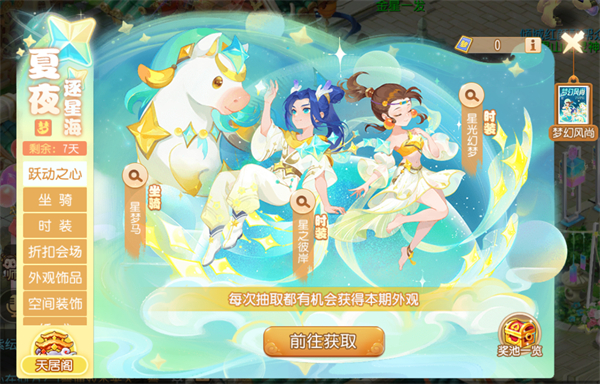 跃动之心的等级越高,玩家可获取的奖励越珍贵,升至七级更可免费领取本期外观大奖,将全新时装星之彼岸/星光幻梦,或全新坐骑星梦马收入囊中!若玩家想快速升级,不妨使用六个心动水晶进行强化抽取,有50%的概率升级,且两次后必升级成功!