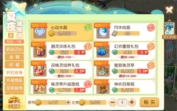此外,特卖商城“夏夜逐星海”也迎来了上新!玩家可从中选购全新星梦童话头像框/冒泡框、星梦足迹、美梦星队标和幸运星头饰等新外观,还能在折扣会场购入低至5折的实用道具!
