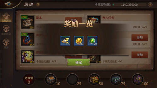 2、活动系统获取精力值,活动分为日常和限时活动,日常活动全天开放,可随时完成活动任务从而增加活跃值,活跃值积累到一定数值便可开启宝箱获得精力值,每个数值的宝箱都有20点精力值(活跃值宝箱于每日凌晨4点更新)。